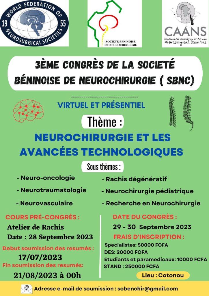 La Société Béninoise de Neurochirurgie est fière d’annoncer la tenue de son troisième Congrès annuel, qui se déroulera du 29 au 30 septembre 2023. L’événement offre une plateforme unique pour le partage des connaissances, des recherches récentes et des innovations dans le domaine de la neurochirurgie.